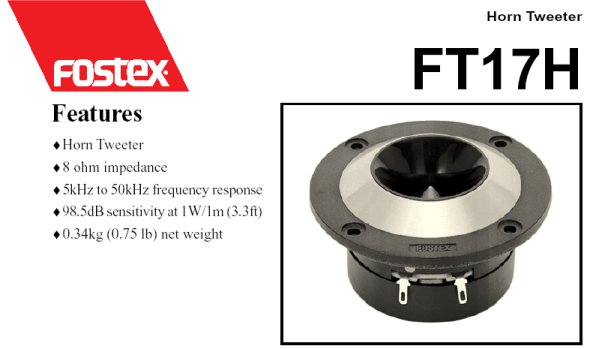 However, something got me REALLY interested. That is, upgrading the tweeters from the current fabric Audax TM025F15 to the horn tweeter Fostex FT17H. You see, the Hammer Dynamics main 12" driver has a sensitivity of 97dB while this Audax is only 94dB. This explains the VERY relaxed treble. The Fostex, at 98.5dB is not only a better match, but it boasts an impressive frequency response of 5kHz to 50kHz! Wholly moley!