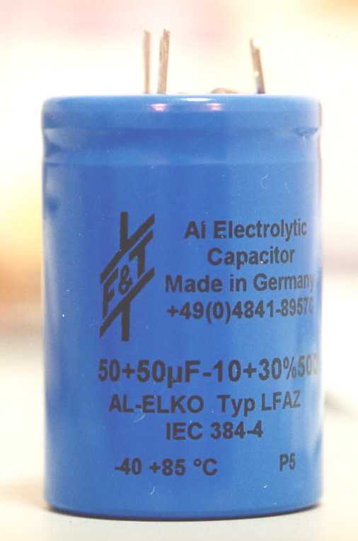 F&T 50+50uF/500V Radial Electrolytic Can Capacitor. Made in Germany to the specs of LCR shown above. RM42