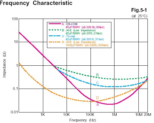 Impedance frequency characteristic of OS-CON compared to other types of capacitors. OS-CON shows a nearly ideal curve. At 100kHz, note that OS-CON 47uF has nearly the same ESR as a low impedance aluminium eletrolytic capacitor of 100uF.