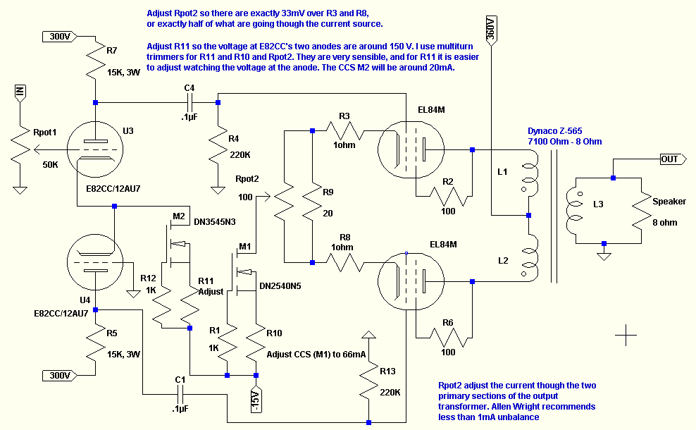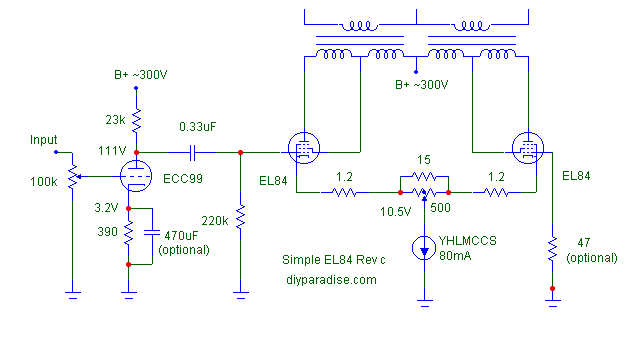 I built one stereo channel in conformity with your Simple EL84 amplifier circuit and tested it today. It works unobjectionably, although I'm not using the output transformer and the power supply you recommended. B+ is at only 280V, Ik is at 43 mA per tube (using a matched pair of STANDARD BRAND tubes I even didn't need to install the trimpot and 15 ohm resistor). Hence the total constant current is at 86 mA.